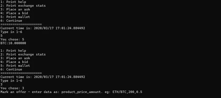A console-based Trade Market Simulator featuring a CSV reader for market data, an order book for managing trades, a wallet to track balances and transactions, and an interactive command interface for user interaction.