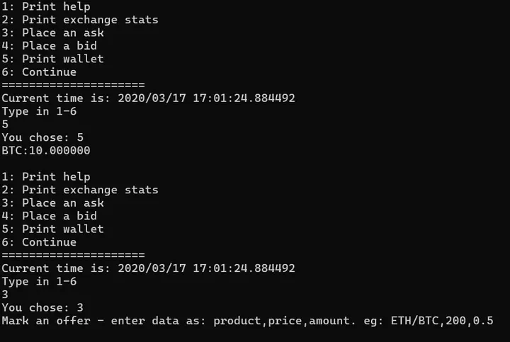 A console-based Trade Market Simulator featuring a CSV reader for market data, an order book for managing trades, a wallet to track balances and transactions, and an interactive command interface for user interaction.